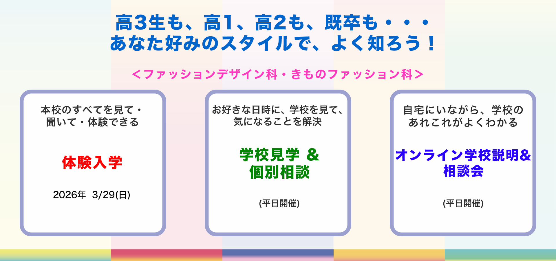 「ファッションデザイン科」と「きものファッション科」を併せ持ち、”ファッションの現場で即戦力となるプロの育成”をモットーに、一人一人に行き渡る少人数制の指導を実施…